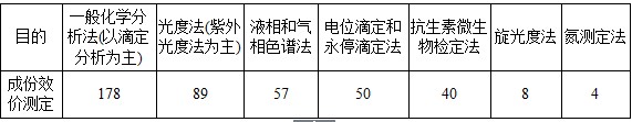 表11 各種分析方法和儀器在有效成份(效價(jià))測(cè)定中被選用情況(種、次)