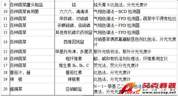 人們廣為食用的蔬菜有20多種、并有相應(yīng)的脫水、速凍、鹽漬、油漬和罐頭制品、質(zhì)檢標(biāo)準(zhǔn)中,除與種類有關(guān)的各不相同的形態(tài)、色澤、質(zhì)地、成熟度以及其他感官指標(biāo)之外,還有4大類具有共性的重要理化指標(biāo),即營(yíng)養(yǎng)成份、有害元素、農(nóng)藥殘留和特殊品種的特定標(biāo)準(zhǔn),這些都需用分析儀器檢測(cè),可概要?dú)w納如表8所示。