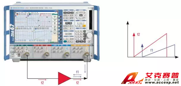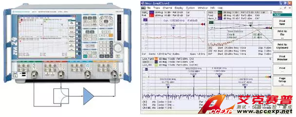 對于有源器件的測試,除需要測試小信號S參數(shù),還要測試相應(yīng)的非線性特性指標(biāo),如P1dB,三階交調(diào)點(diǎn),諧波失真等。因三階交調(diào)測試需要儀表提供一個(gè)雙音激勵(lì)信號,對于四端口ZVA40,標(biāo)配帶有兩個(gè)獨(dú)立的內(nèi)部源,因此可以單獨(dú)完成放大器的三階交調(diào)測試,圖24給出了測試連接圖及測試結(jié)果。對于功率放大器,有時(shí)還要測試其正常工作狀態(tài)下的S參數(shù),如輸出端口的熱駐波比。圖25給出了基于ZVA的熱駐波比測試連接示意圖,Port3給放大器提供一個(gè)激勵(lì)信號f2,使其正常工作,Port2輸出一個(gè)不同頻率的小信號f1,用于測試放大器輸出駐波比,建議f1與f2相差1MHz,那么在接收機(jī)側(cè)通過設(shè)置合適的IF BW就可以輕松地實(shí)現(xiàn)二者的分離,從而完成熱駐波比的測試。