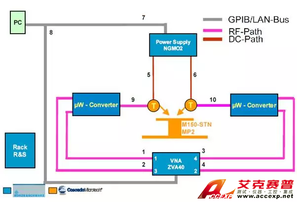 在片測試時(shí),芯片的每次連接都會(huì)導(dǎo)致電路參數(shù)和測試數(shù)據(jù)的改變,影響器件建模和工藝優(yōu)化,以及器件的準(zhǔn)確測量。利用R&S矢量網(wǎng)絡(luò)分析儀ZVA,一次連接即可實(shí)現(xiàn)多種參數(shù)的在片測量,包括標(biāo)準(zhǔn)S參數(shù)、時(shí)域測量、變頻測量、真差分測量 (混合模式S參數(shù))、噪聲系數(shù)測量等,對于功率器件,也可以實(shí)現(xiàn)脈沖S參數(shù)的測量,確保所有電路參數(shù)的準(zhǔn)確可靠一致。