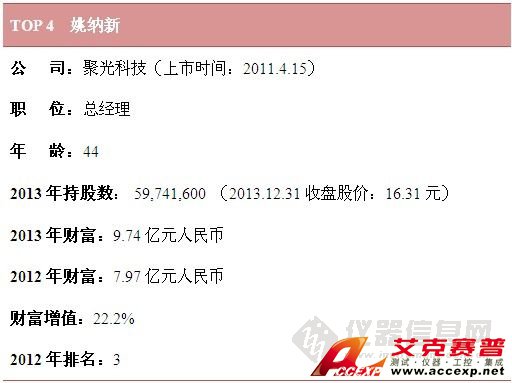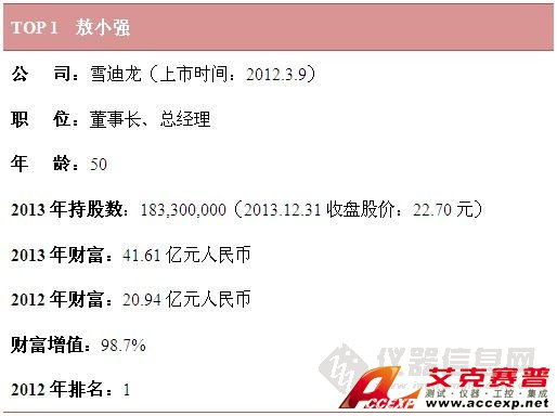 就財富值而言,雪迪龍敖小強憑借100%的增幅穩(wěn)居財富榜榜首,位居第2位的是聚光科技董事長王健,其2013年財富為18.52億元人民幣,排名第3的是天瑞儀器董事長劉召貴。