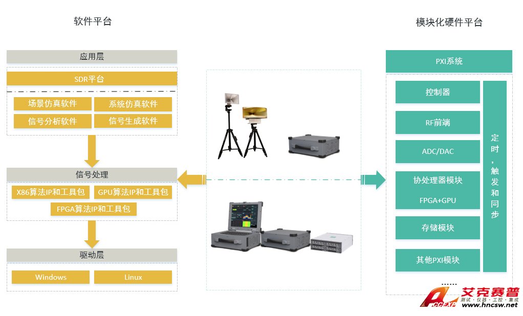 柔性電子對抗測試驗證平臺基于軟件無線電和認(rèn)知無線電設(shè)計理念,采用模塊化硬件,搭載軟件套件,構(gòu)建一個可重構(gòu)的、可擴(kuò)展、可升級的電子對抗綜合測試平臺。同時柔性電子對抗測試驗證平臺也是針對電子對抗應(yīng)用的高實時性及多功能性要求,全新打造基于CPU+FPGA+GPU異構(gòu)計算的高性能實時處理平臺,具有強(qiáng)大的通道擴(kuò)展能力和靈活的功能可重構(gòu)能力。此外,該平臺也提供MATLAB接口和數(shù)據(jù)接口,方便用戶進(jìn)行自定義信號處理,以應(yīng)對快速更迭的技術(shù)需求。