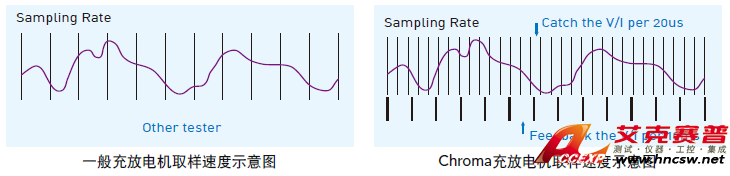 一般電池充放電機,直接使用軟件讀取電流值作電量計算,然而軟件的數據讀取速度有限制,將造成動態電流的容量計算誤差過大。Chroma 藉由提高V/I 取樣率,并透過兩次積分法,提供更佳精準的容量計算,電流變化時的數據不遺漏,不受數據傳輸速率影響。