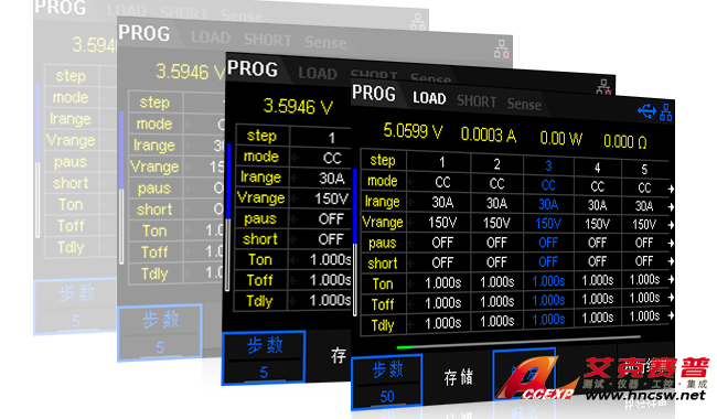 Program 功能可以模擬CC、CV、CR、CP、LED五種測試。通過對列表步數(shù)、存儲、觸發(fā)等參數(shù)進行設定,負載可以模擬總共可以編輯10個測試文件,每個測試文件最多支持 50 步。
