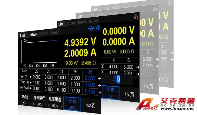 List 功能支持負載搭建多步的,定時的,不同帶載狀態(tài)的測試環(huán)境。通過編輯單步的步值、脈寬和斜率,負載可以生成多種復雜的序列組合,以滿足不同的測試需求。