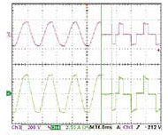 圖2為橋式整流的典型線路。在RLC模式下,使用者可透過設定RLC值,100%模擬實際待測物的行為。圖3 & 4分別是透過實際被動負載(電阻、電感、電容)與使用RLC負載模式量測。圖5則為定電流模式下所得到的波形。