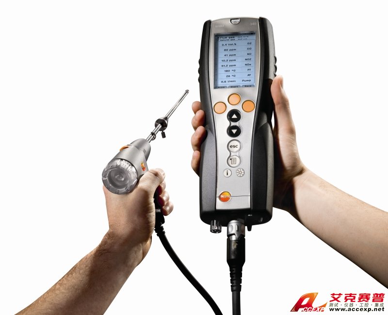 testo 340煙氣分析儀, 包括充電電池,出廠報告及背帶, 標配O2傳感器及差壓/流速傳感器。