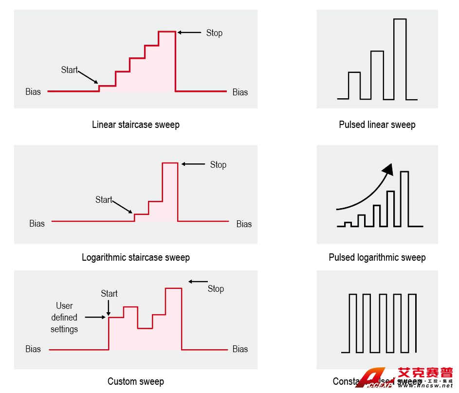 IT2805 SMU具備標準和列表LIST掃描功能。標準SWEEP模式下,支持線性和對數(shù)模式,單次和雙次掃描功能以及恒定和脈沖掃描功能。列表LIST掃描功能可以有效地執(zhí)行任意波形輸出,在表征響應隨應用電壓或電流而變化的測試中非常有用,用戶可以使用Excel導入或面板編輯的方式,生成一個任意形狀的掃描曲線,最多可以導入99999點數(shù)據(jù),是U-I和I-U特性測試的理想選擇。