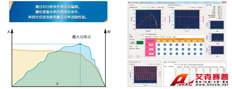 由于太陽能電池利用率不僅與其內(nèi)部特性有關(guān),還受到天氣、季節(jié)、溫度、照度、云遮、下雨和下雪等因素的影響,在不同的時段會具有不同的I-V特性。因此光伏逆變器必須具備應(yīng)對策略,實時調(diào)整太陽能電池的工作點,使之始終工作在最大功率點附近,這一過程就稱之為最大功率點跟蹤MPPT。IT6000PV系列標配的太陽能電池矩陣仿真軟件可以在實驗室的測試環(huán)境下,去直接模擬各種真實條件下的太陽能電池陣列,從而測試光伏逆變器的靜態(tài) & 動態(tài)最大功率點追蹤效能。