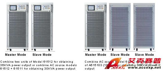 61511/61512/61611/61612交流供應(yīng)器可經(jīng)由(Master-Slave)并聯(lián)輸出模式以達(dá)成使用者對(duì)于高功率的需求。例如:連接5臺(tái)18KVA交流供應(yīng)器在并聯(lián)模式下可實(shí)現(xiàn)90KVA的輸出功率。使用者還可利用專為并聯(lián)模式所開發(fā)的18KVA并聯(lián)專用機(jī)為有效替代slave單機(jī)的解決方案。請(qǐng)參考以下為61511/61512/61611/61612及A615103在并聯(lián)模式下的配置圖。