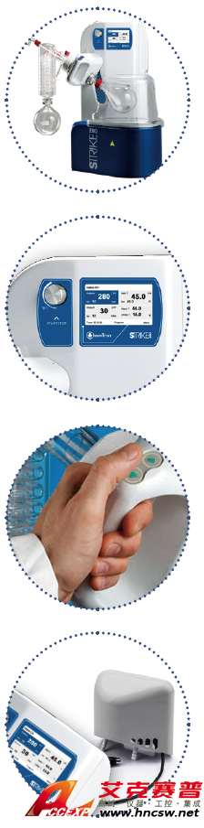 快速、穩定和易用。 提供良好的分離,濃縮和純化解決方案。 Strike 280 配備計時器,程序控制,自動提升等功能。 更多的安全措施,包括:過熱設置和保護,斷電時自動起升,實時監測蒸汽和冷卻水溫度等。