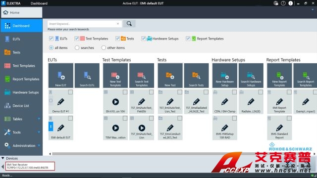 R&S?ELEKTRA 測試軟件控制完整的 EMC 測試系統,自動進行被測設備 (EUT) 的騷擾 (EMI) 和抗擾度 (EMS) 認證測試。R&S?ELEKTRA 根據通用標準簡化測試系統配置和測試描述。它可加快執行測試,并迅速生成全面的測試報告。